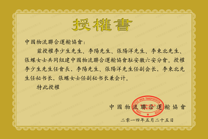中国物流联合运输协会六安分会授权书